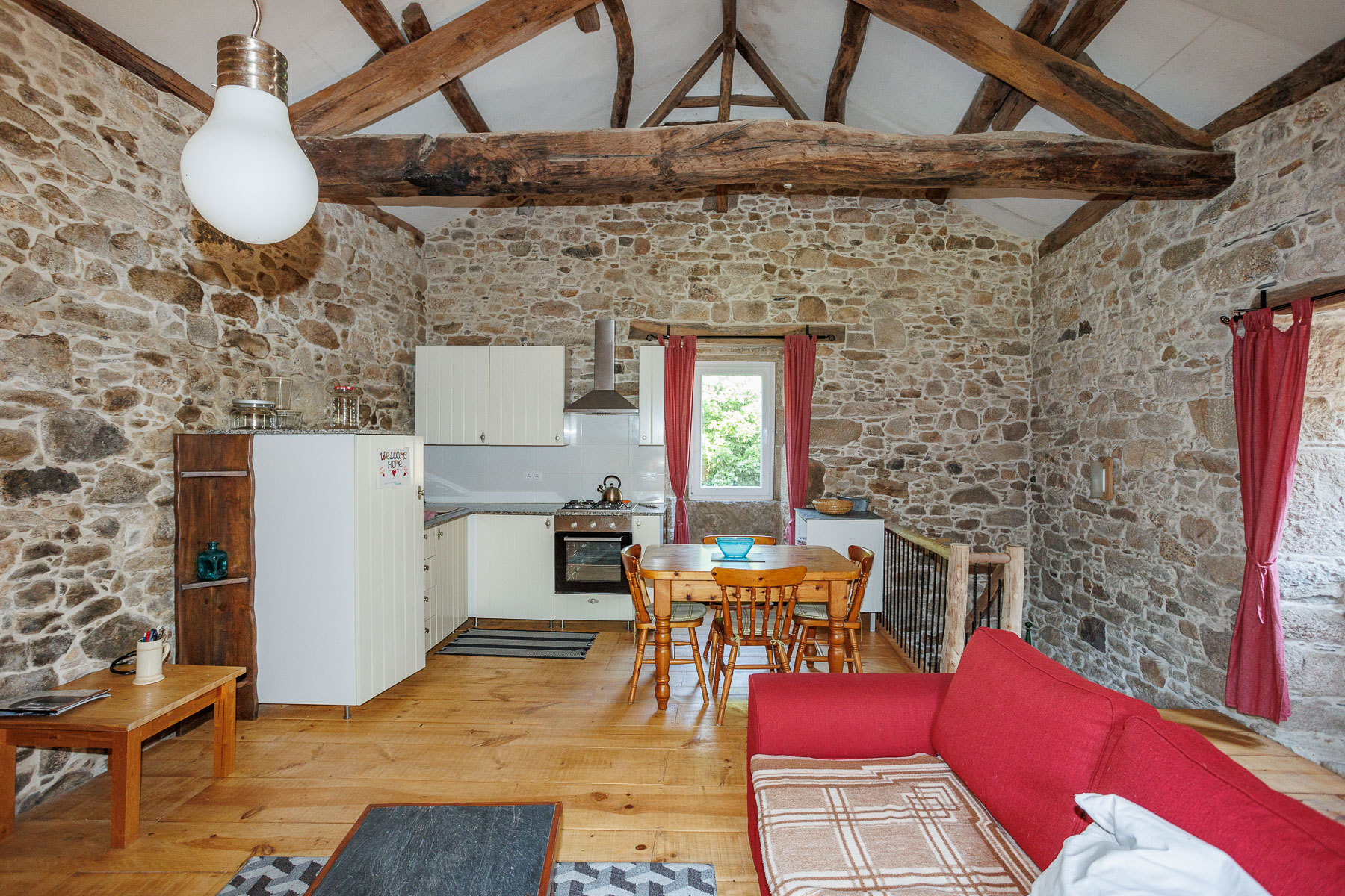 Casa de dos plantas con 108 m2 aproximadamente. Piedra y madera. Se accede por la planta superior a un salón-comedor-cocina, con chimenea. En la planta de abajo hay un gran dormitorio y un buen baño. Desde esta habitación se sale al exterior, a un pequeño porche que conecta con el jardín y, de nuevo, un espacio para descansar y disfrutar en tranquilidad. Es de piedra y con vigas de madera. El diseño interior es acogedor y acorde con el entorno y la fachada de piedra. Actualmente se utiliza como B&B.
