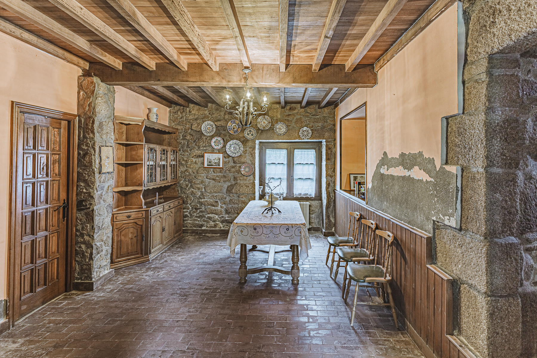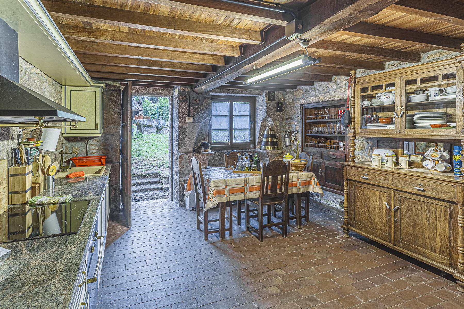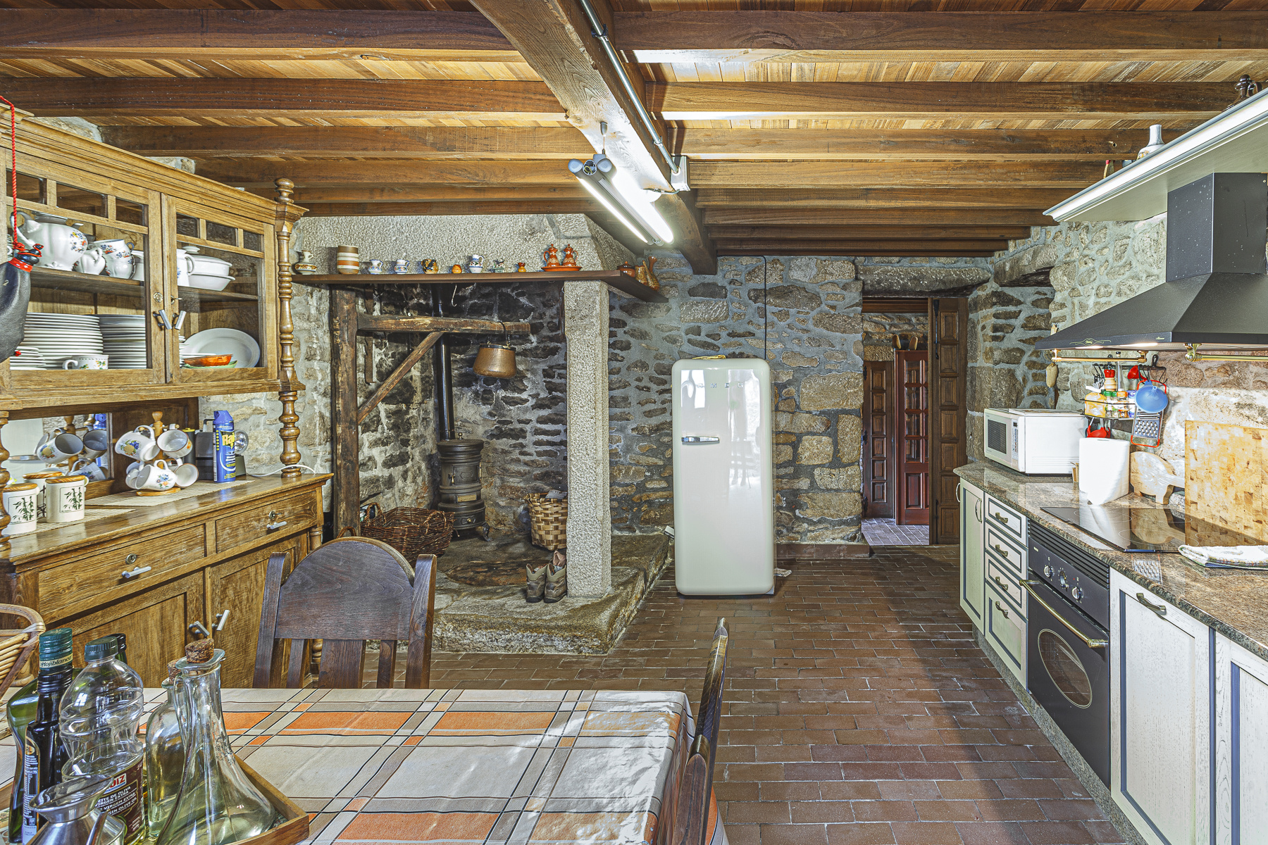 La distribución de la casa es la siguiente. Planta baja. Hall de acceso. Cocina, con lareira y fregadero tradicional de piedra. Además de todos los elementos actuales necesarios para cumplir su función. Bodega y cuarto de caldera para calefacción (depósito de gasoil de 1.000 litros). Salón con chimenea. Y comedor. Cuarto de lavadora y tendedero. Un cuarto de baño completo.