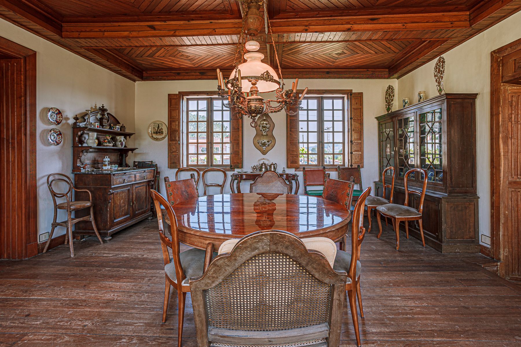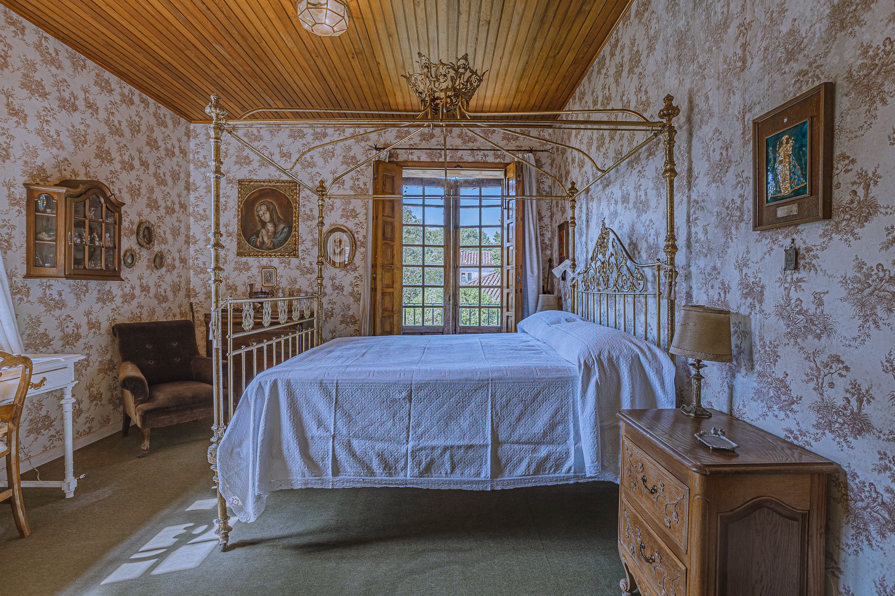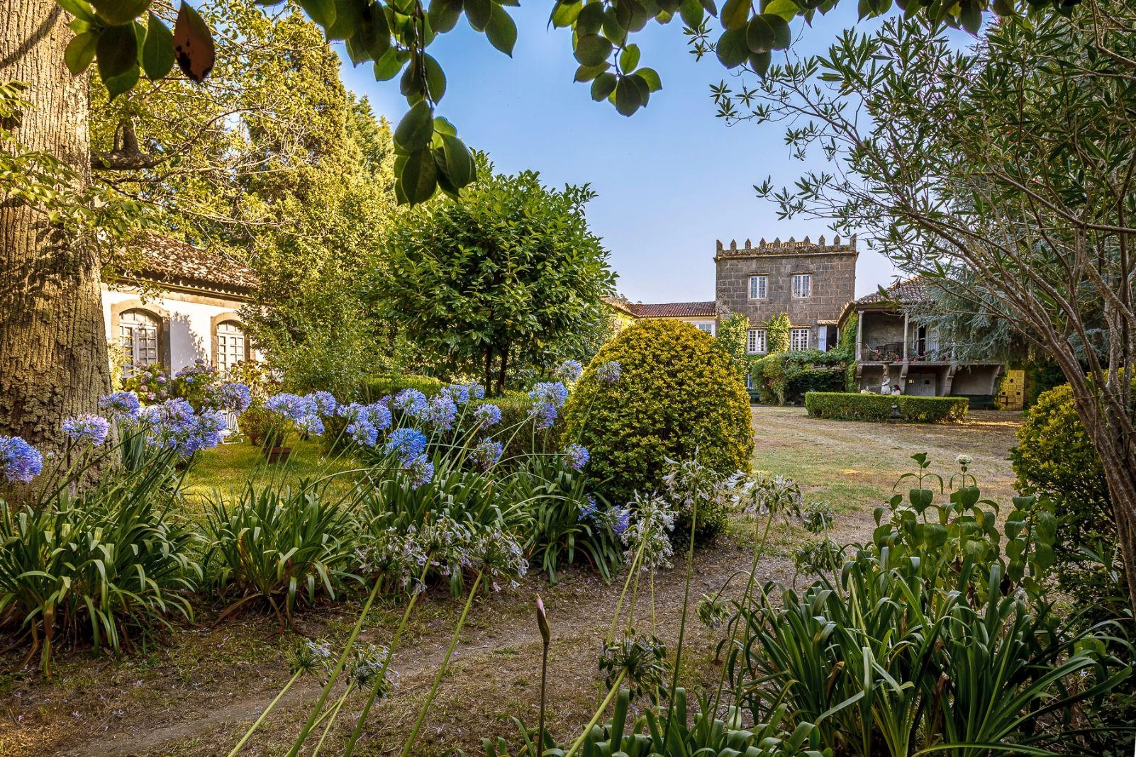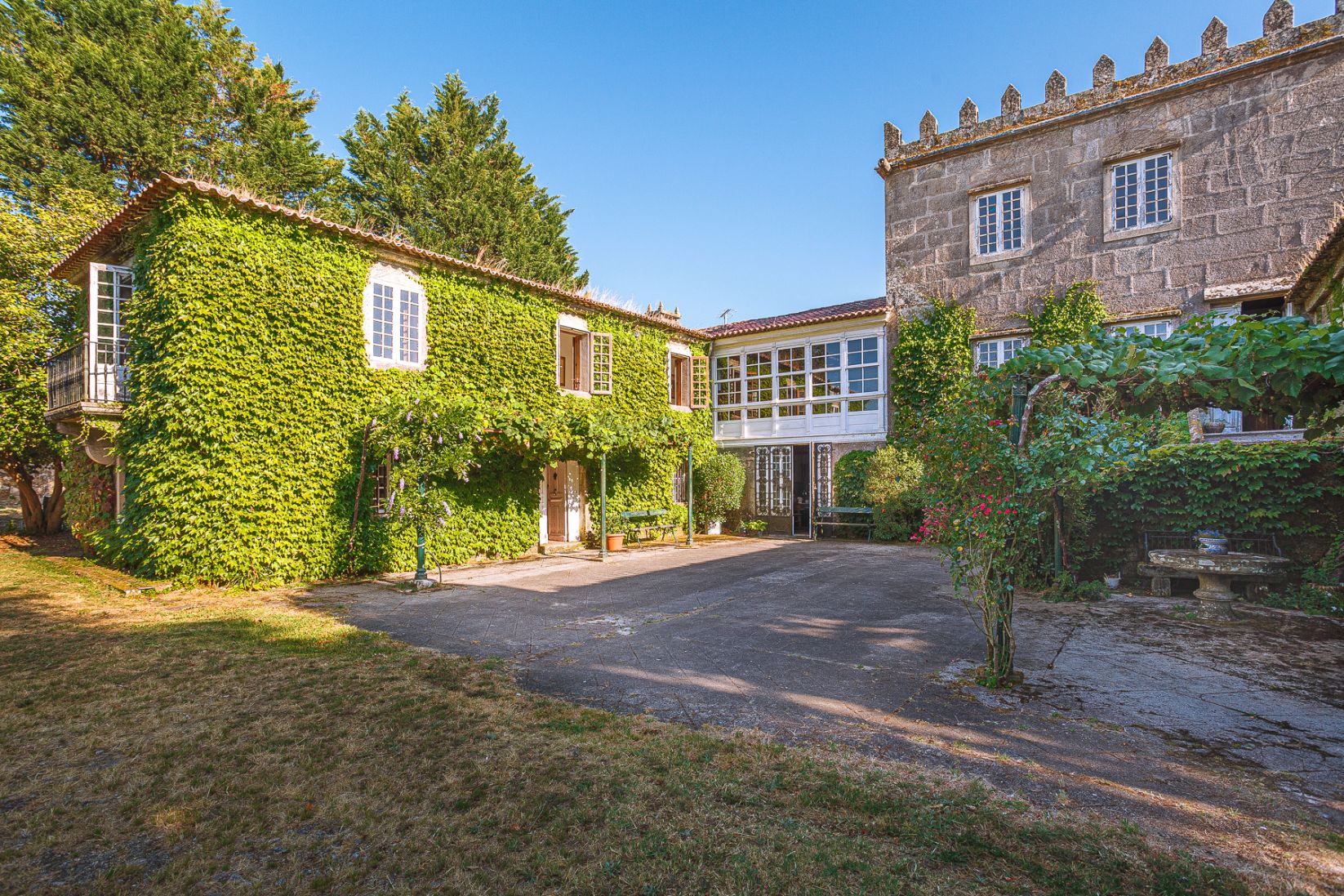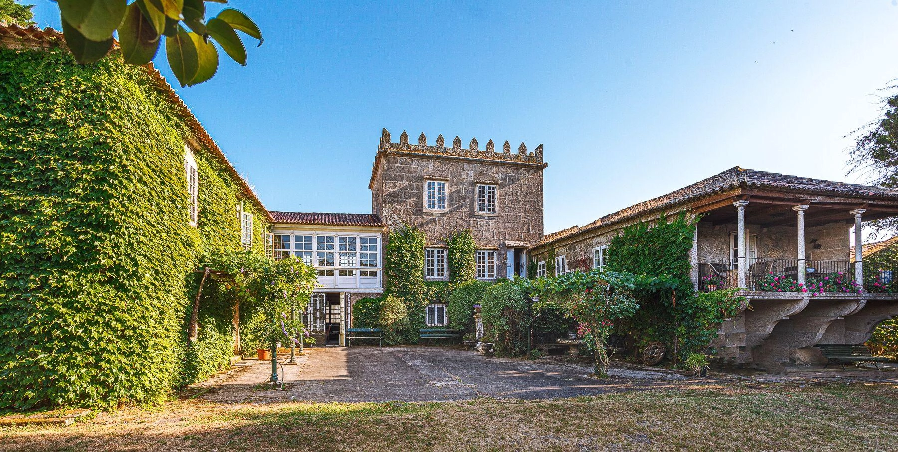El gran edificio principal, en piedra de granito, tiene dos plantas y una robusta torre almenada. Una distribución generosa: 12 dormitorios, 6 cuartos de baño, comedor, sala de estar, salón con galería o solana, despacho, biblioteca, un gran office y una hermosa cocina. Además, lagar, bodega y garaje externo de 30 m2. La superficie aproximada de este edificio, 675 m2.