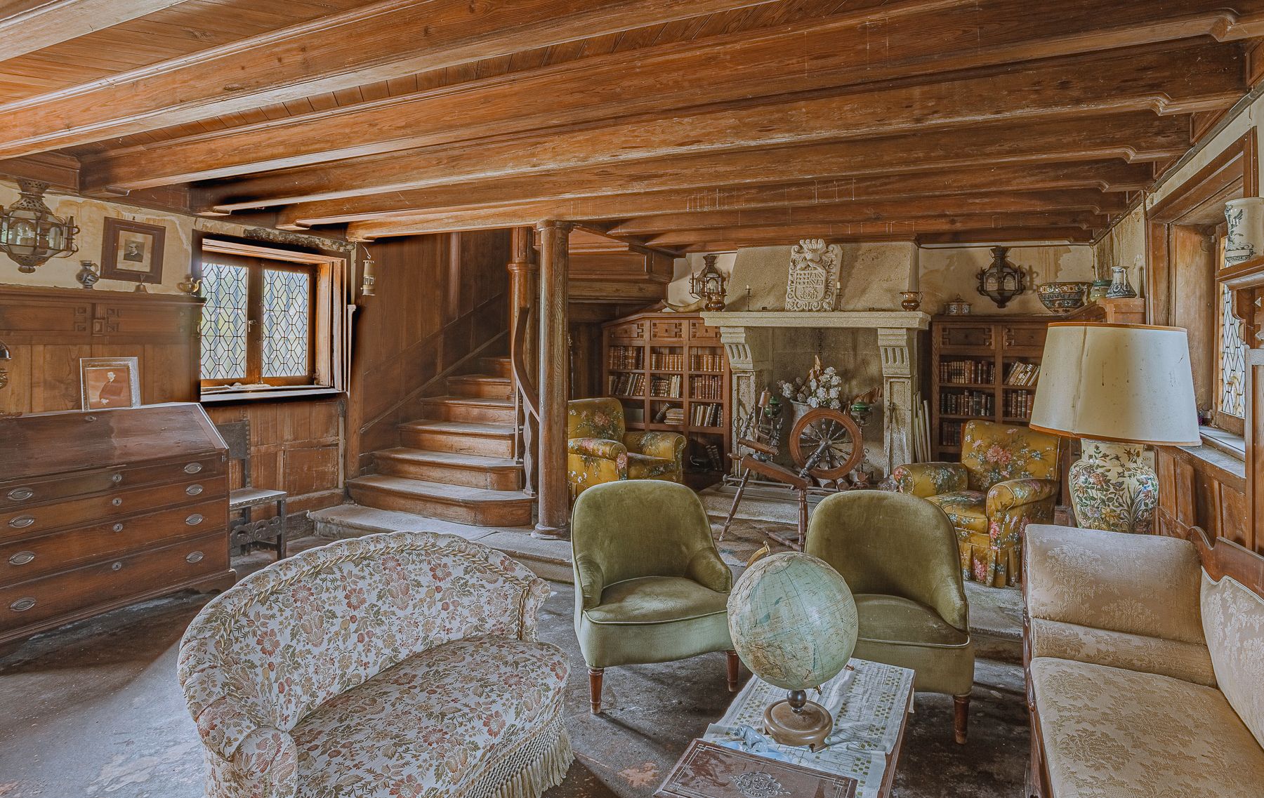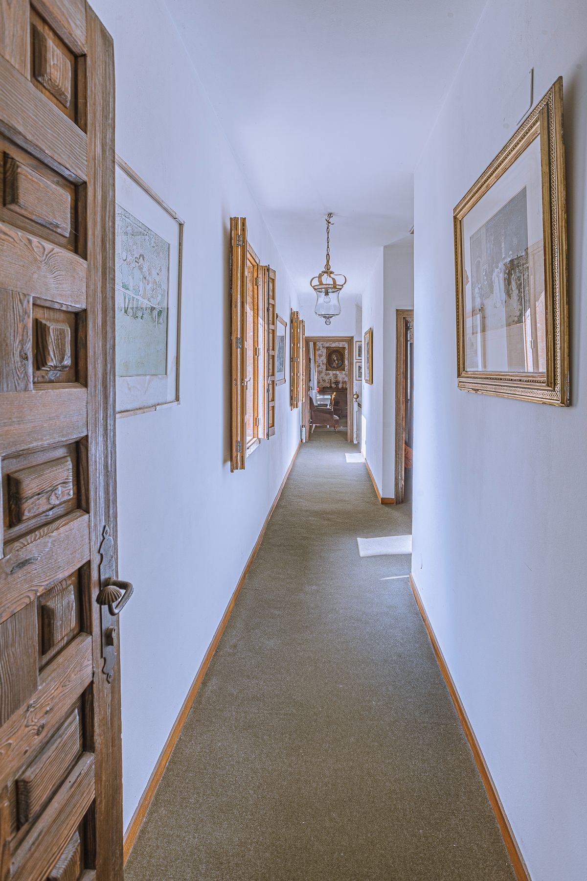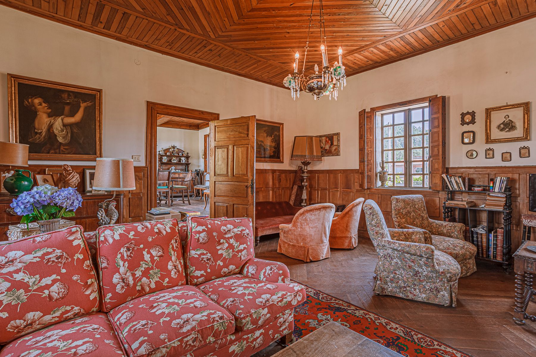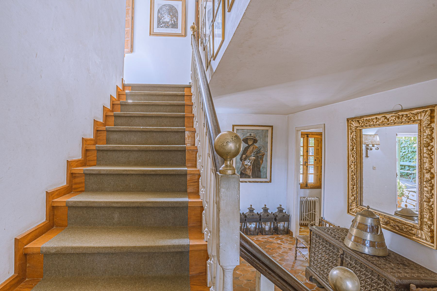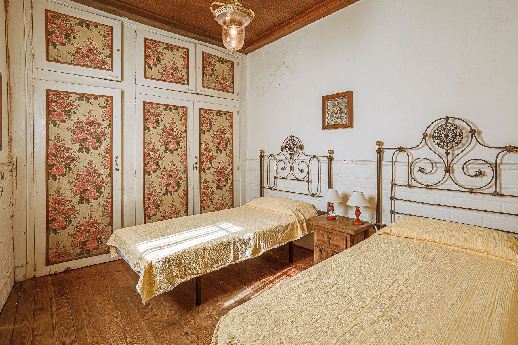 El gran edificio principal, en piedra de granito, tiene dos plantas y una robusta torre almenada. Una distribución generosa: 12 dormitorios, 6 cuartos de baño, comedor, sala de estar, salón con galería o solana, despacho, biblioteca, un gran office y una hermosa cocina. Además, lagar, bodega y garaje externo de 30 m2. La superficie aproximada de este edificio, 675 m2.