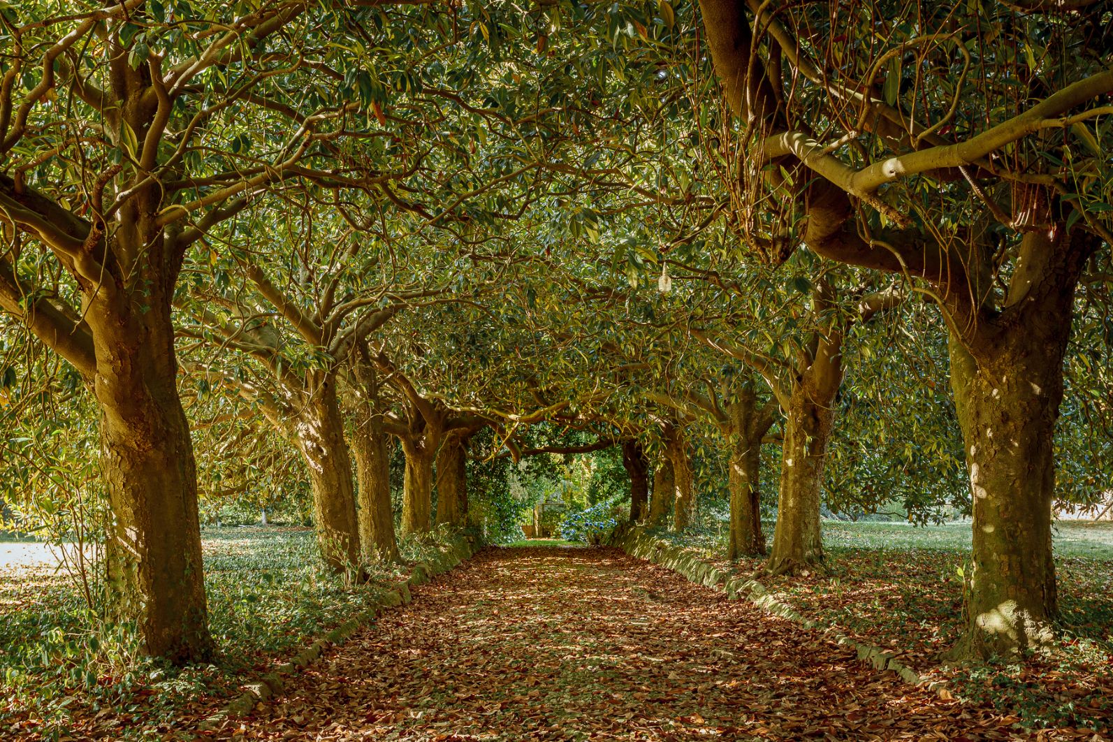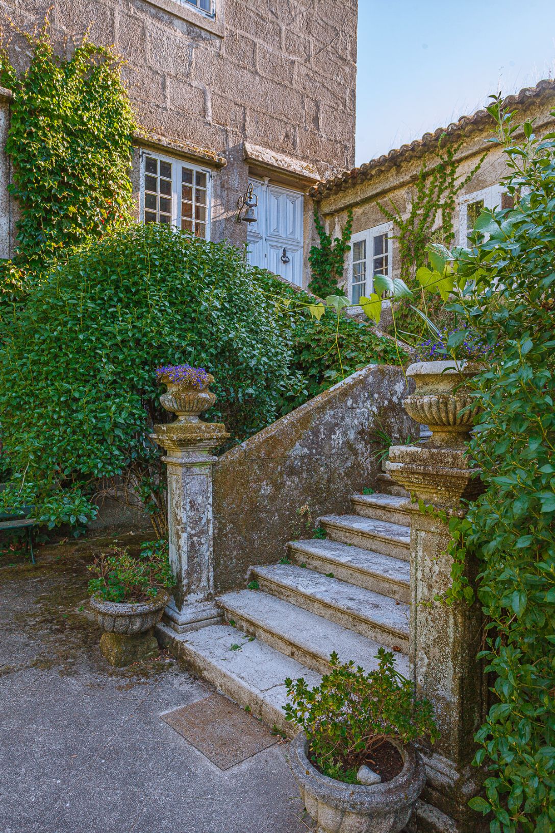 Cruzamos un gran portalón en piedra con dos leones a los lados de los escudos familiares, impresionante. Desde ahí se abre el paseo flanqueado de frondosos magnolios hasta avistar el Pazo de La Parda con una fuente en el centro de la plazoleta que estructura el jardín.
