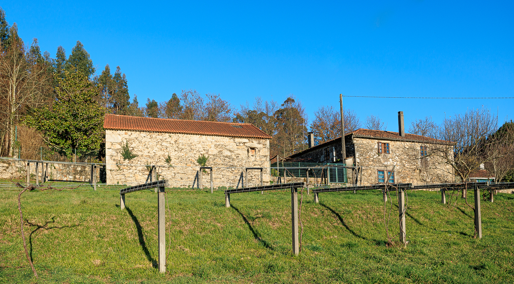 En la finca hay un alpendre en buen estado, que tiene un lagar en su interior y mucho más espacio. La finca justo debajo de la casa, tiene viñedos sobre alambres.