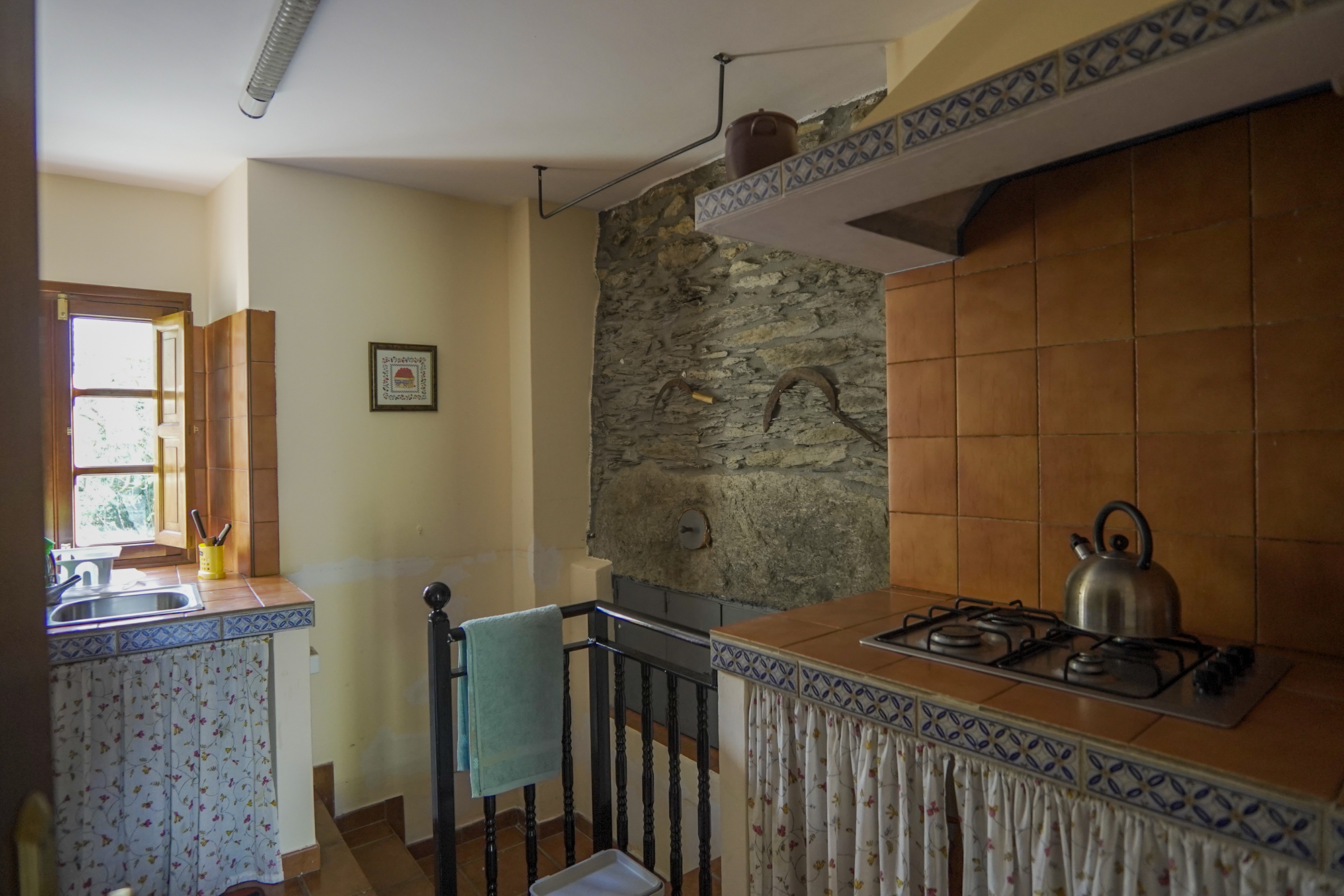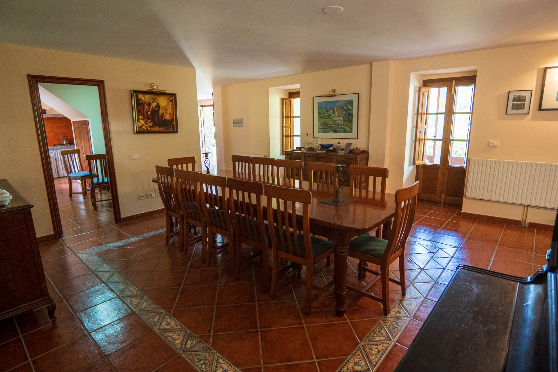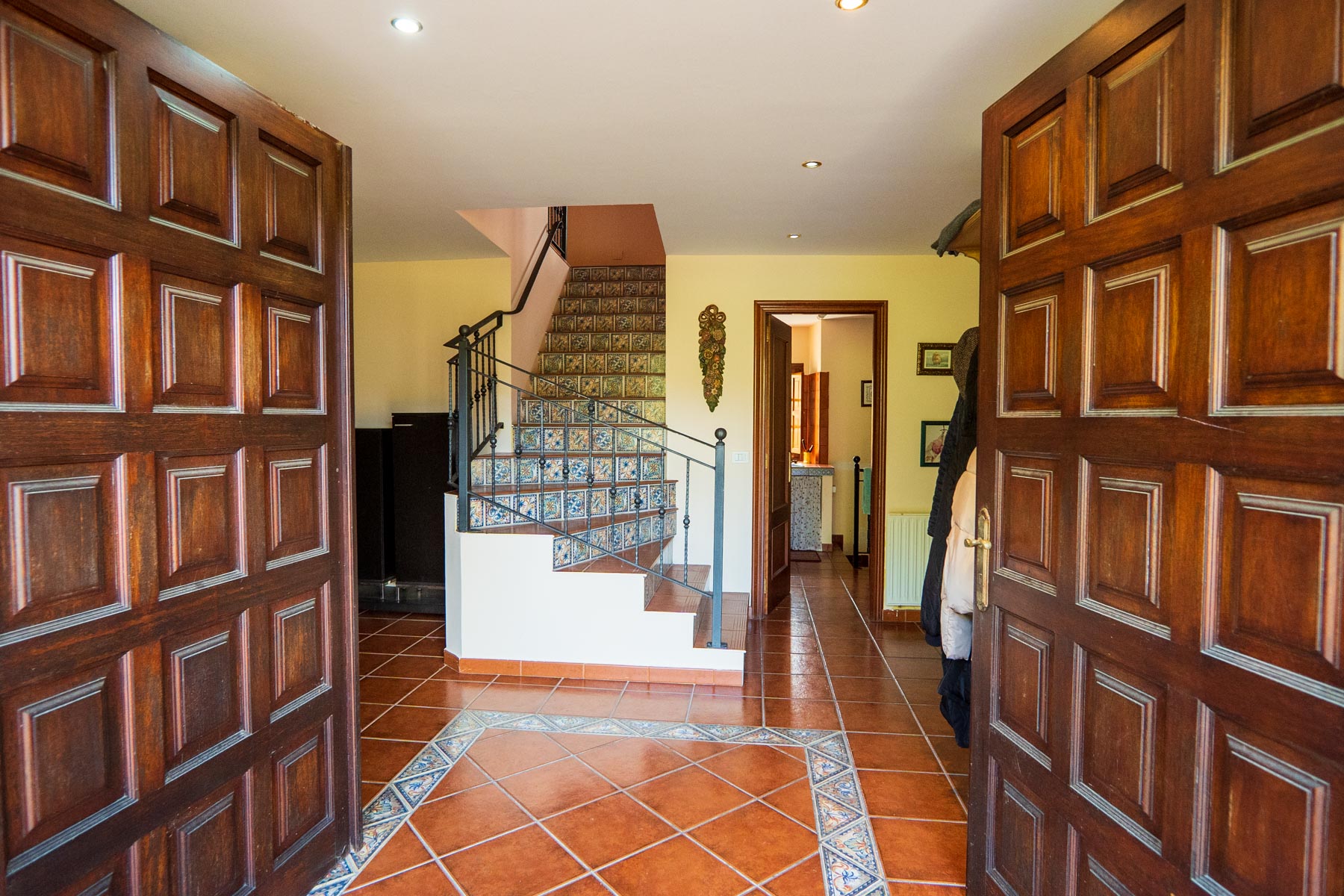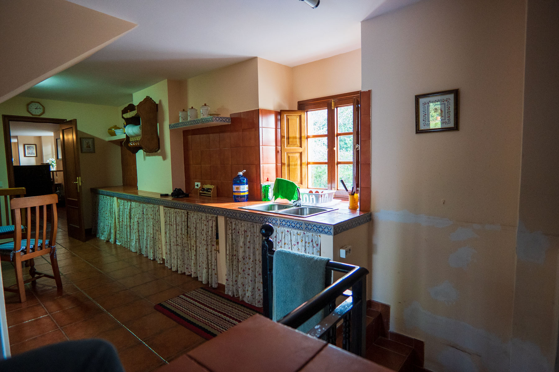 Dentro del vestíbulo, con el aseo de la planta baja, se encuentra la puerta de la cocina y la escalera de azulejos decorativos. El vestíbulo se abre a la enorme sala de estar con la gran mesa de comedor y 10 sillas. Un pequeño escalón y una barandilla de madera dividen la zona de comedor de la sala de estar con su gran chimenea. Las ventanas en un lado son exteriores y en el otro forman las partes superiores de las puertas dobles a la larga veranda con su estufa de leña. La cocina dispone de un horno de pan tradicional y de una cocina de gas En la planta baja se encuentra también la sala de calderas, que hace las veces de taller y lavadero.