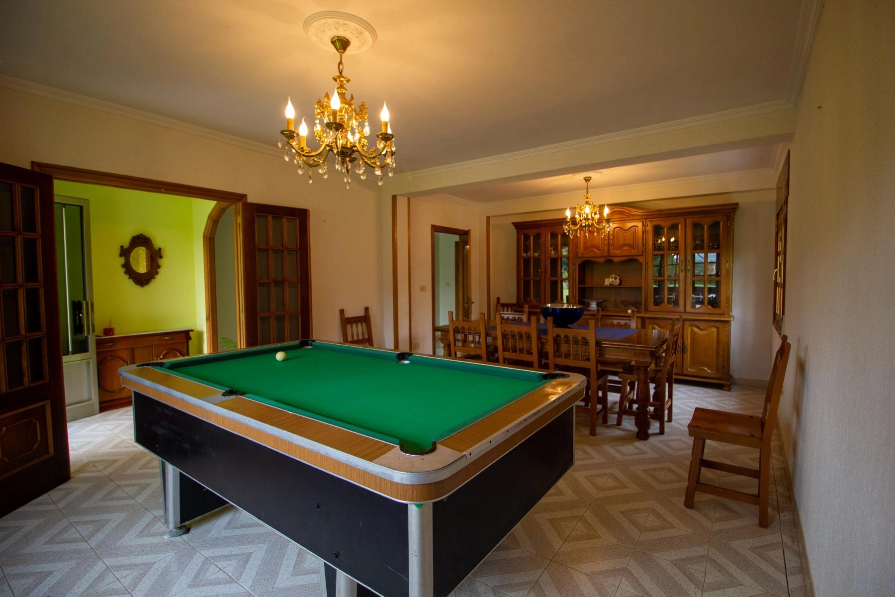 En la planta baja hay una cocina perfectamente equipada y amueblada, lista para funcionar. También se encuentran un cuarto de baño en perfecto estado, junto un enorme salón con una mesa de billar.