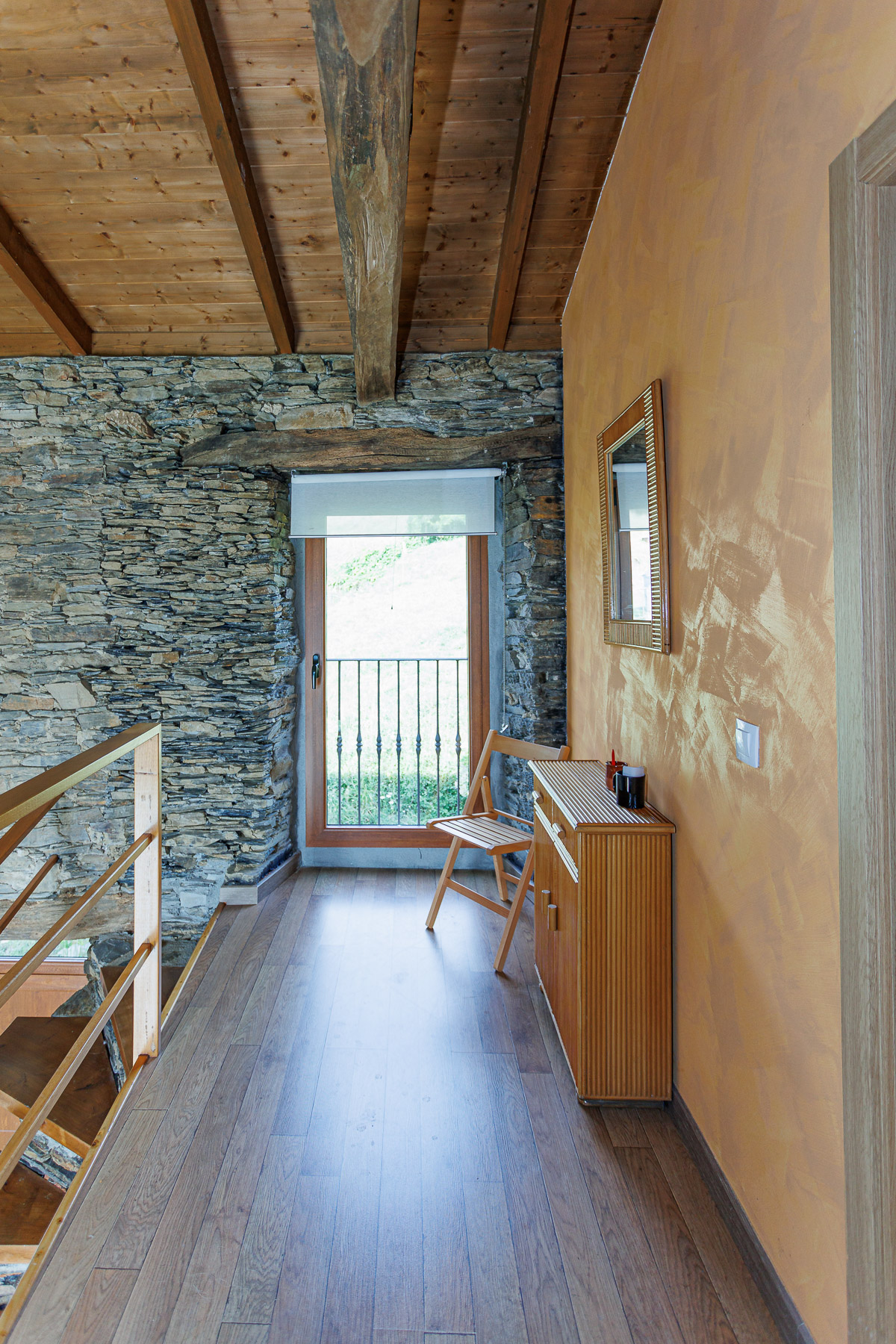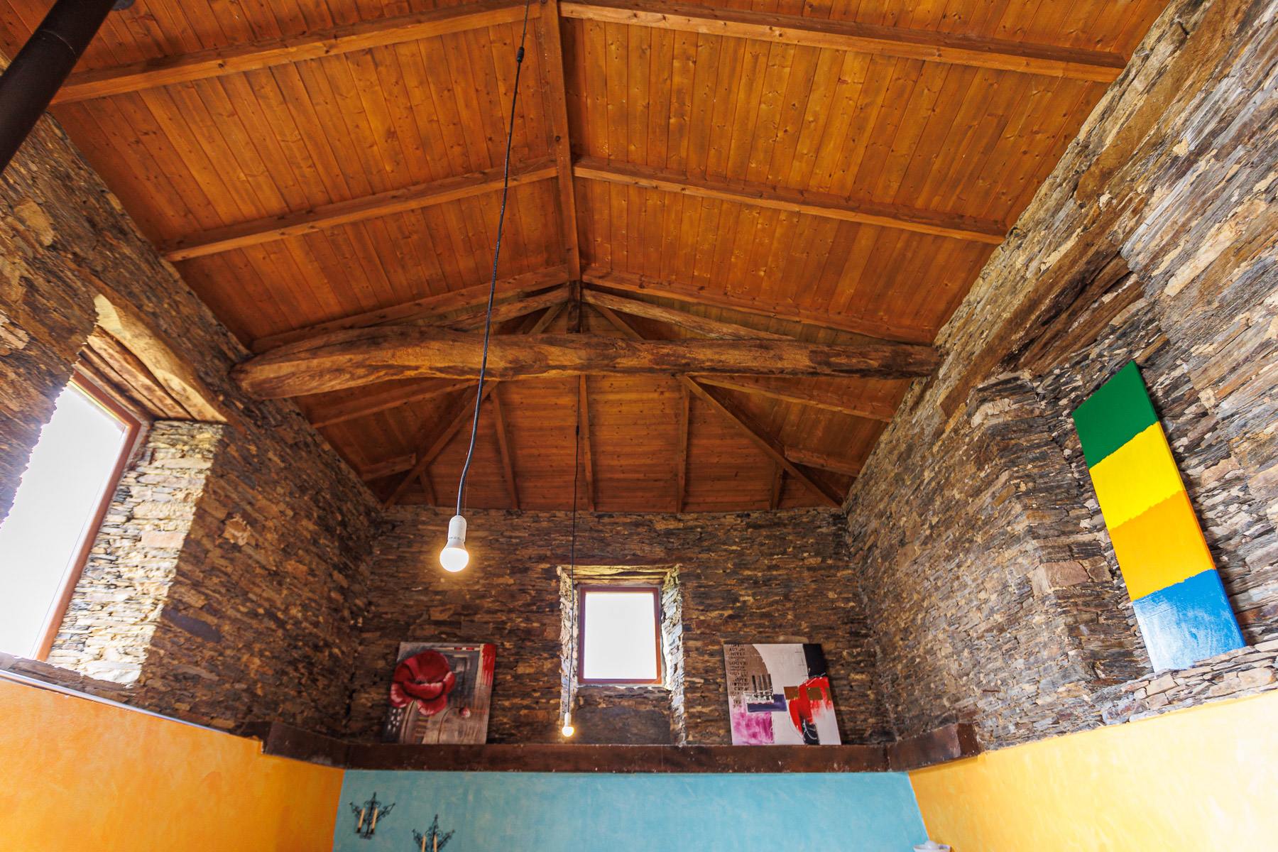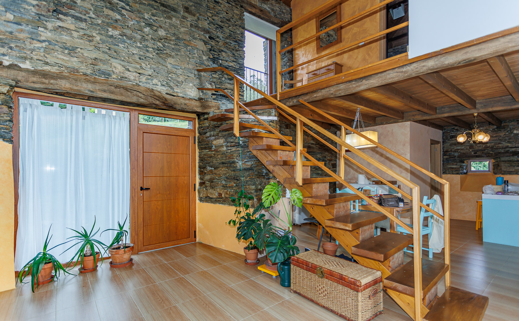 La casa ha sido restaurada de una forma casi única con toda la planta superior este hecho sobre un balcón interior y la calefacción viene de una estufa de leña en la parte baja, pero al tener una chimenea tan larga efectivamente calienta toda la casa. Lo que da un gran espacio interior que llega hasta el techo. Dos habitaciones están en sobre el balcón interior y hay otra mas en la planta baja.