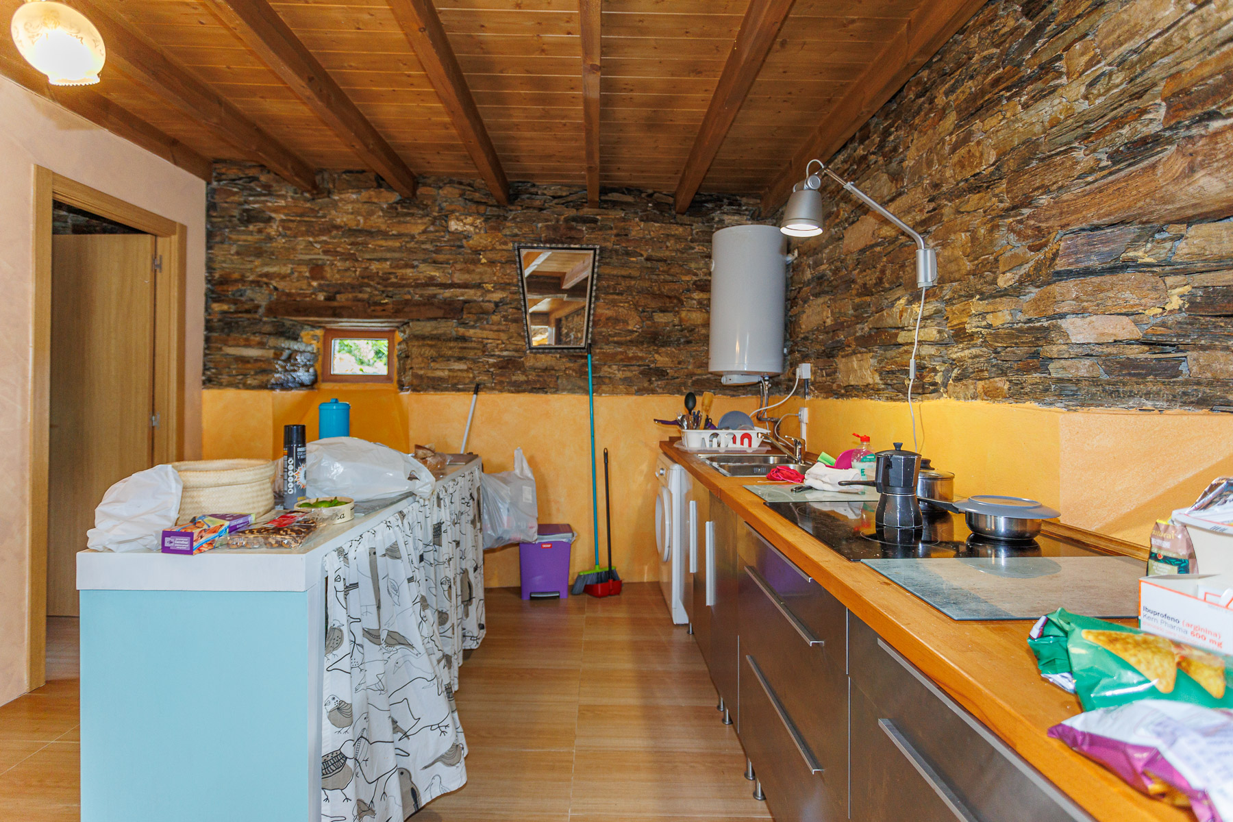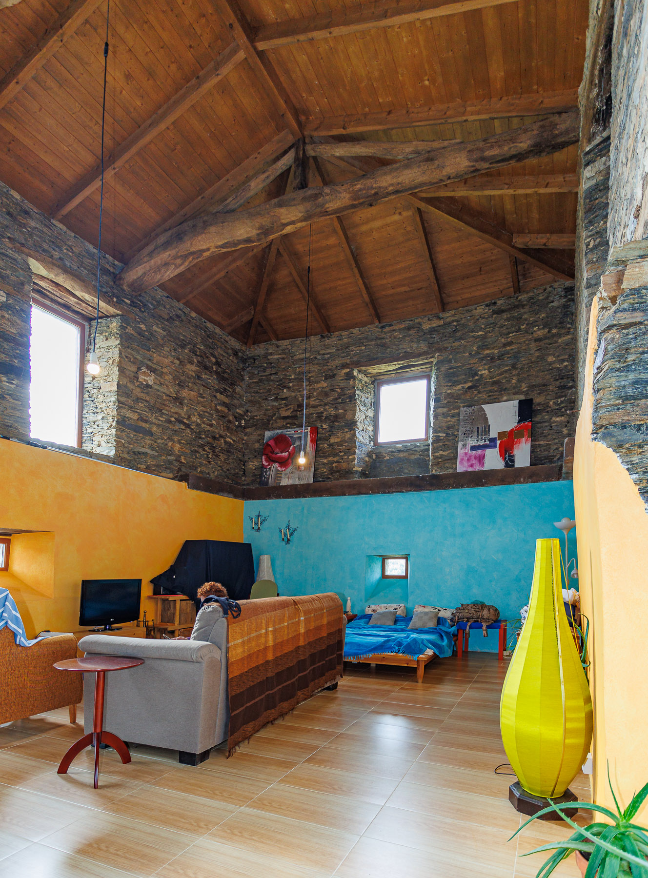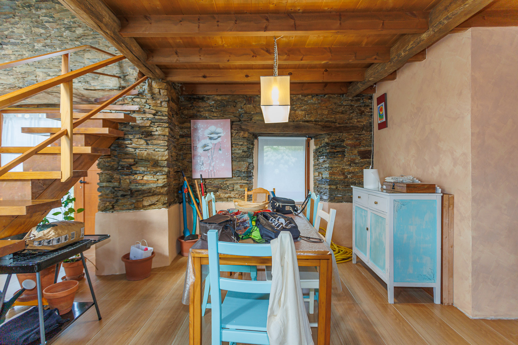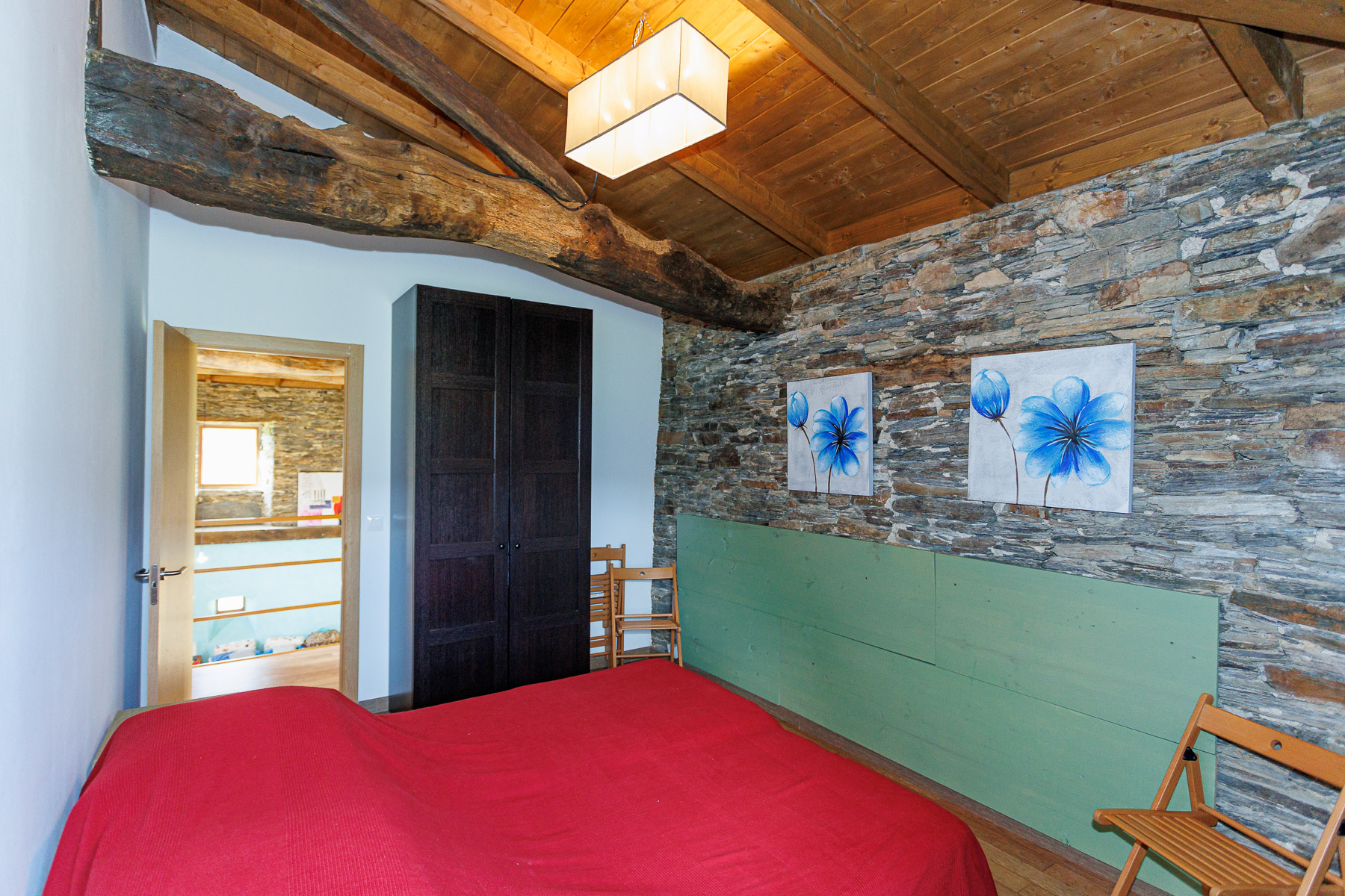 La casa ha sido restaurada de una forma casi única con toda la planta superior este hecho sobre un balcón interior y la calefacción viene de una estufa de leña en la parte baja, pero al tener una chimenea tan larga efectivamente calienta toda la casa. Lo que da un gran espacio interior que llega hasta el techo. Dos habitaciones están en sobre el balcón interior y hay otra mas en la planta baja.