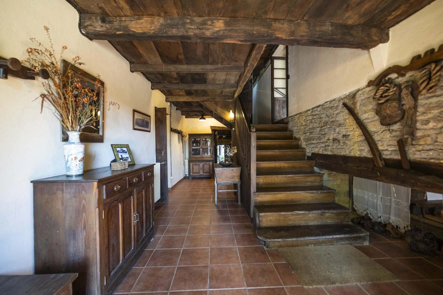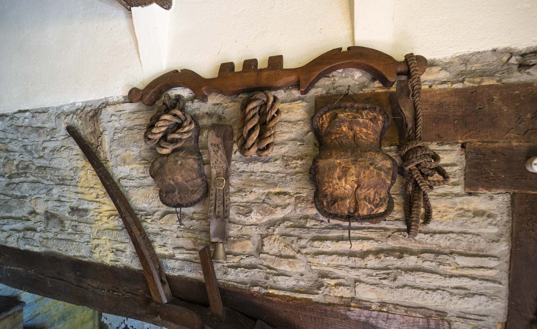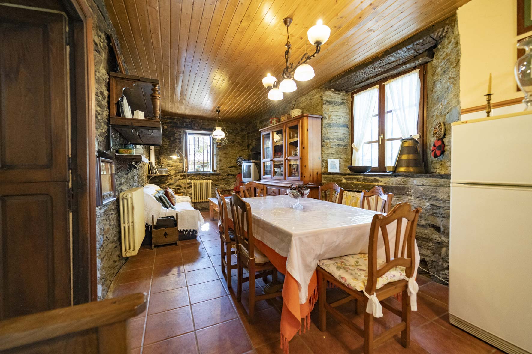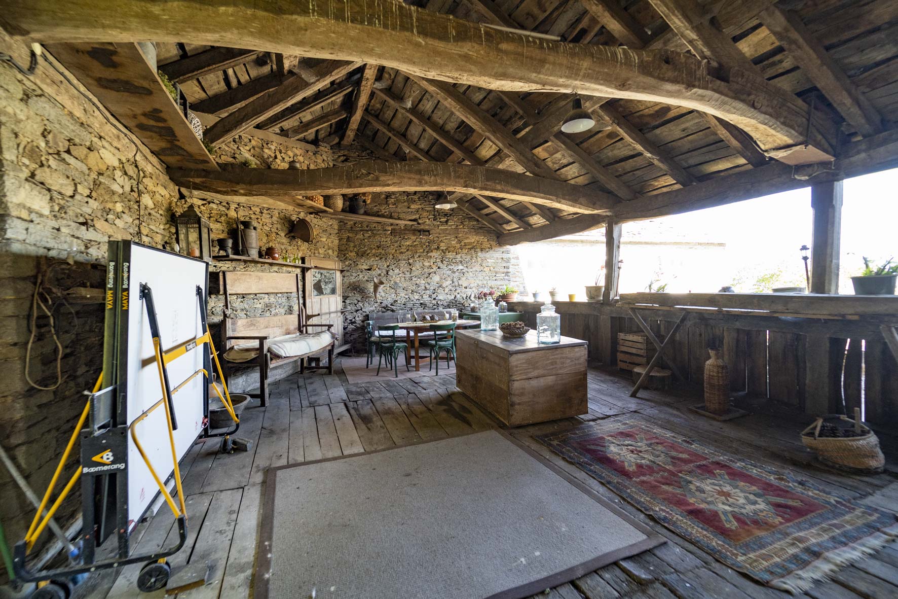 Al entrar a la casa se suele entrar en el bajo donde encontramos con un autentico museo esta la leñera, una colección de herramientas antiguos, un alambique, un horno de pan. Todo debajo de una balconada tradicional impresionante con una mesa de comedor para comer cuando el tiempo lo permite.