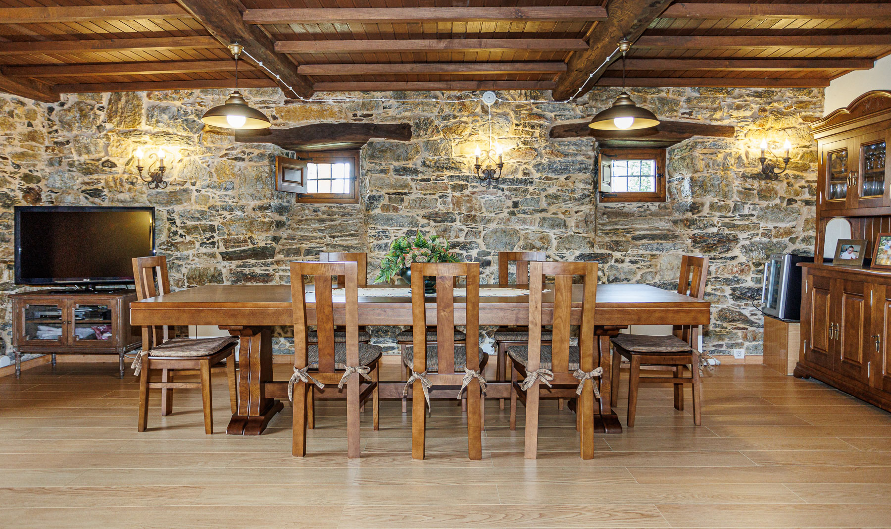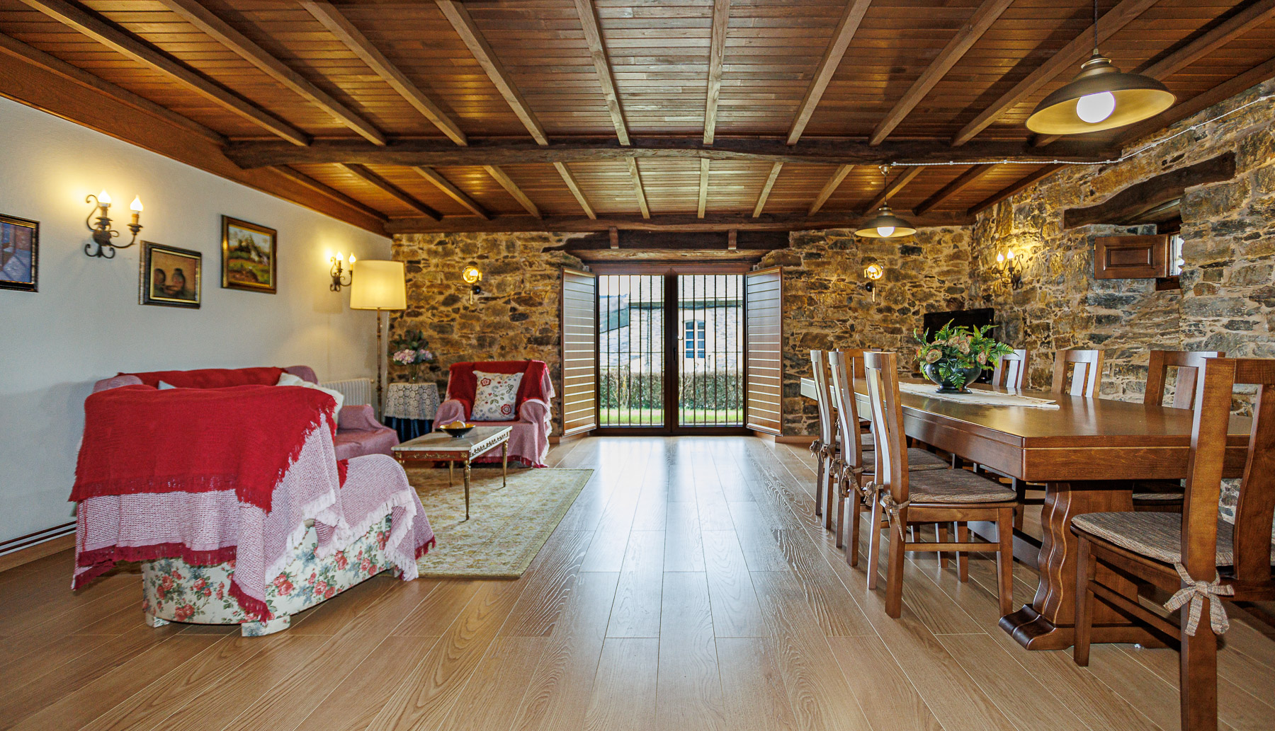 La planta baja de la casa cuenta con una entrada acogedora, un comedor con chimenea para disfrutar de las maravillosas veladas, una gran cocina equipada con lareira y cocina de leña para aquellos que gustan de cocinar, un cuarto de baño, sala de caldera, un pequeño taller y un salón comedor moderno con salida directa a la hermosa finca que rodea la casa.