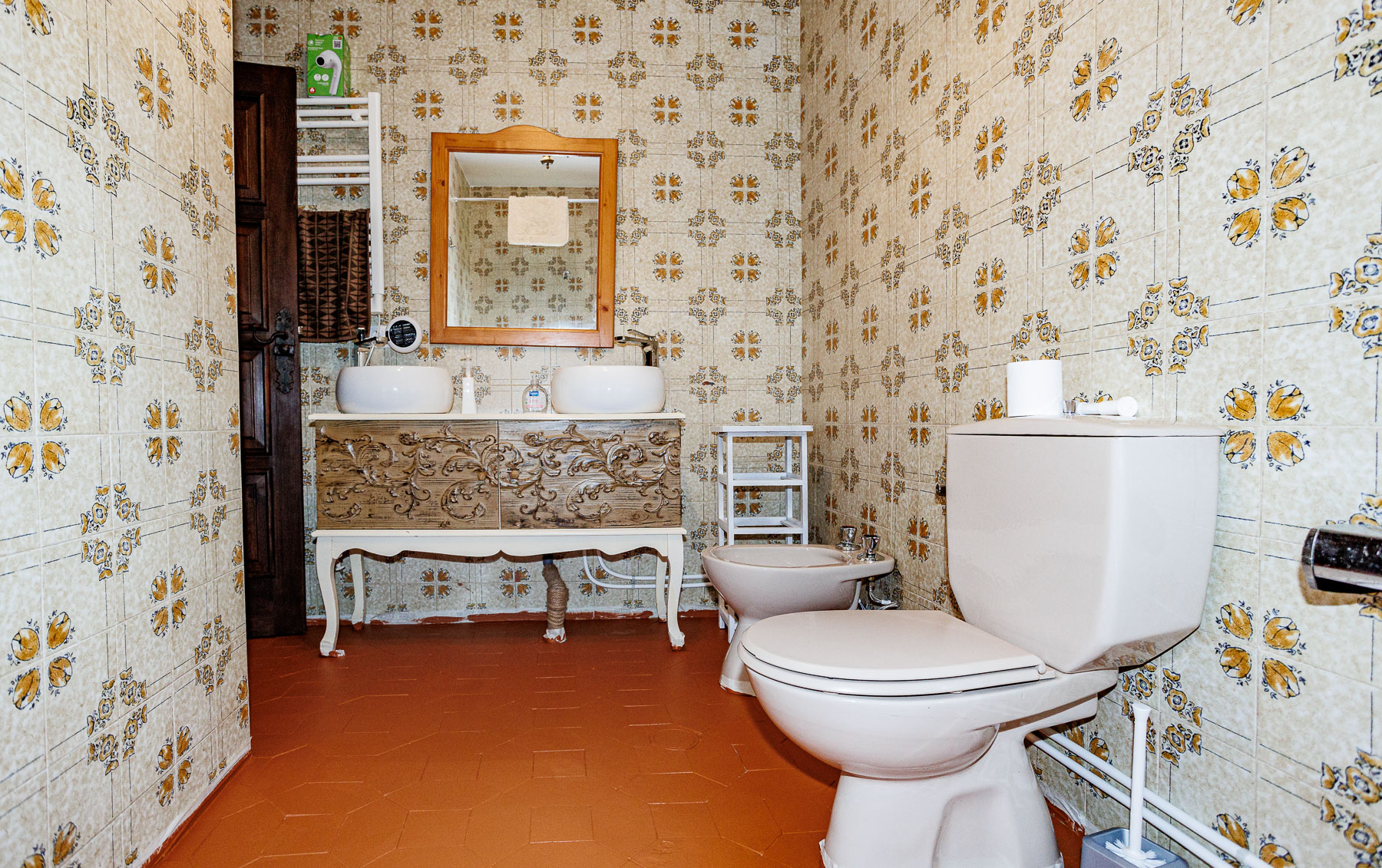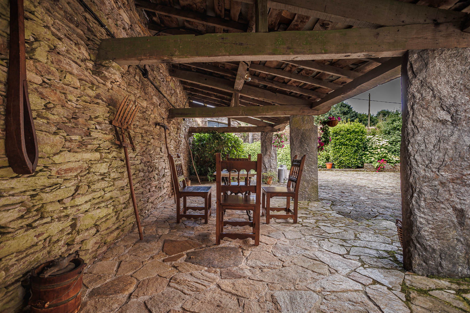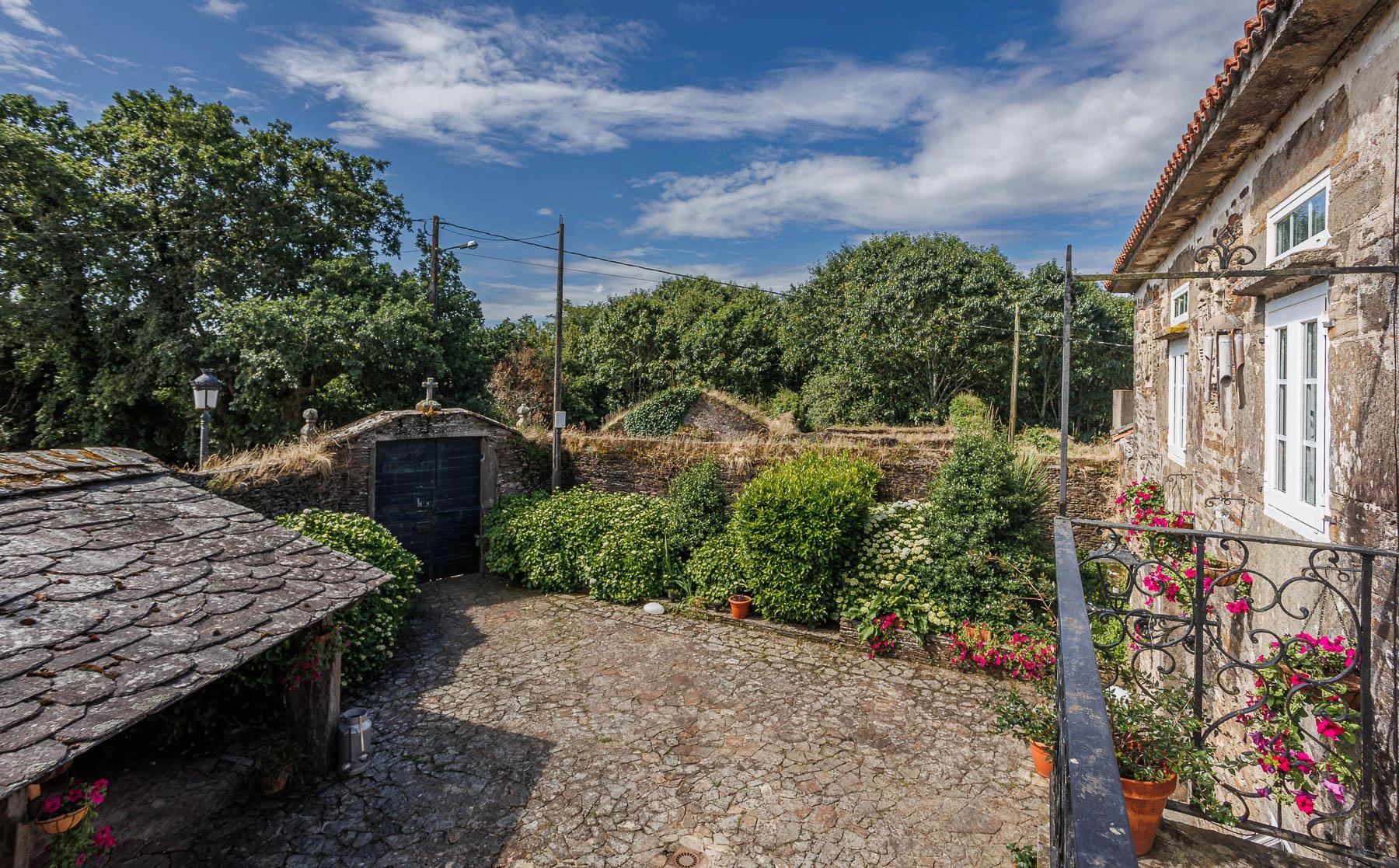 Entrando, y pasando su antiguo portón con esa llave enorme que te traslada a siglos y siglos atrás, encuentras lo que hoy se convirtió en un bar en un cobertizo frente al pazo y que limita el patio interior del pazo. En el mismo límite, hay un pequeño alpendre transformado en cuarto de baño para el uso de los visitantes (sin entrar en la casa) y otro almacén que podría hacer perfectamente un apartamento independiente.
