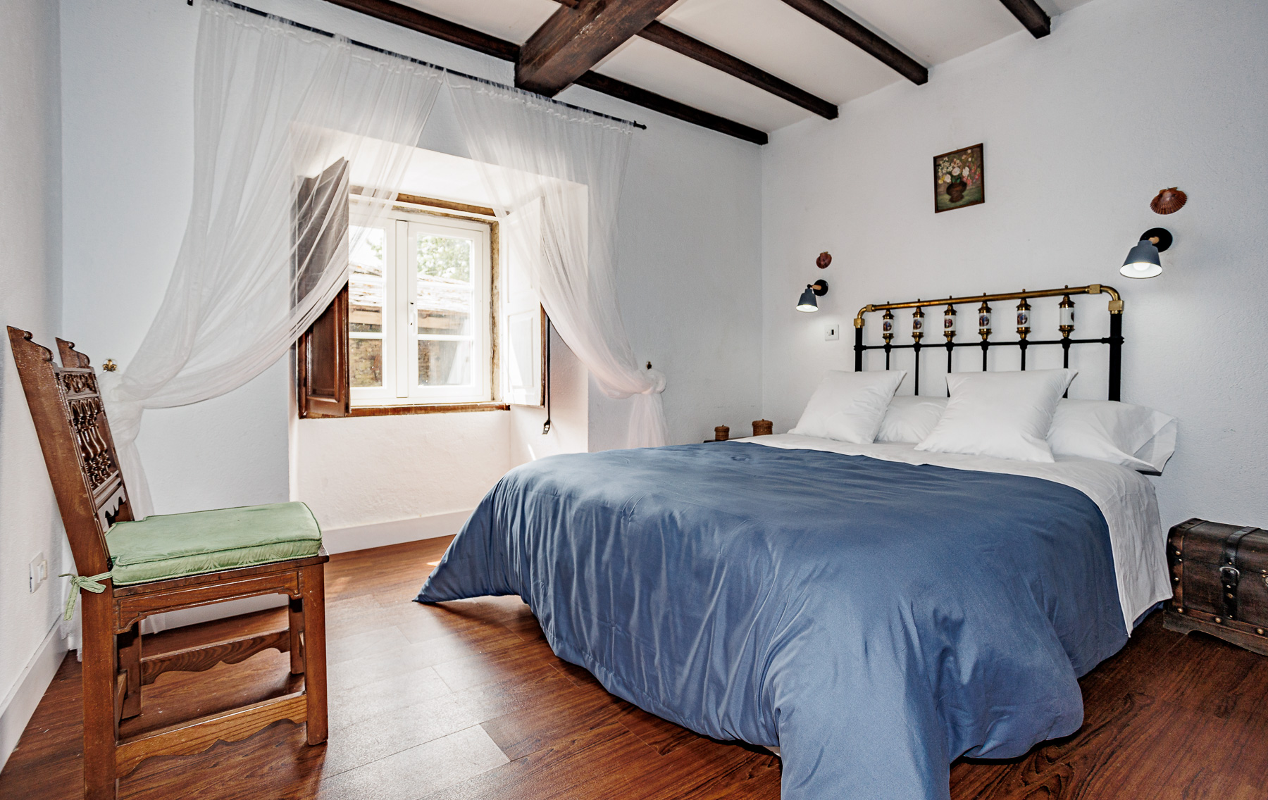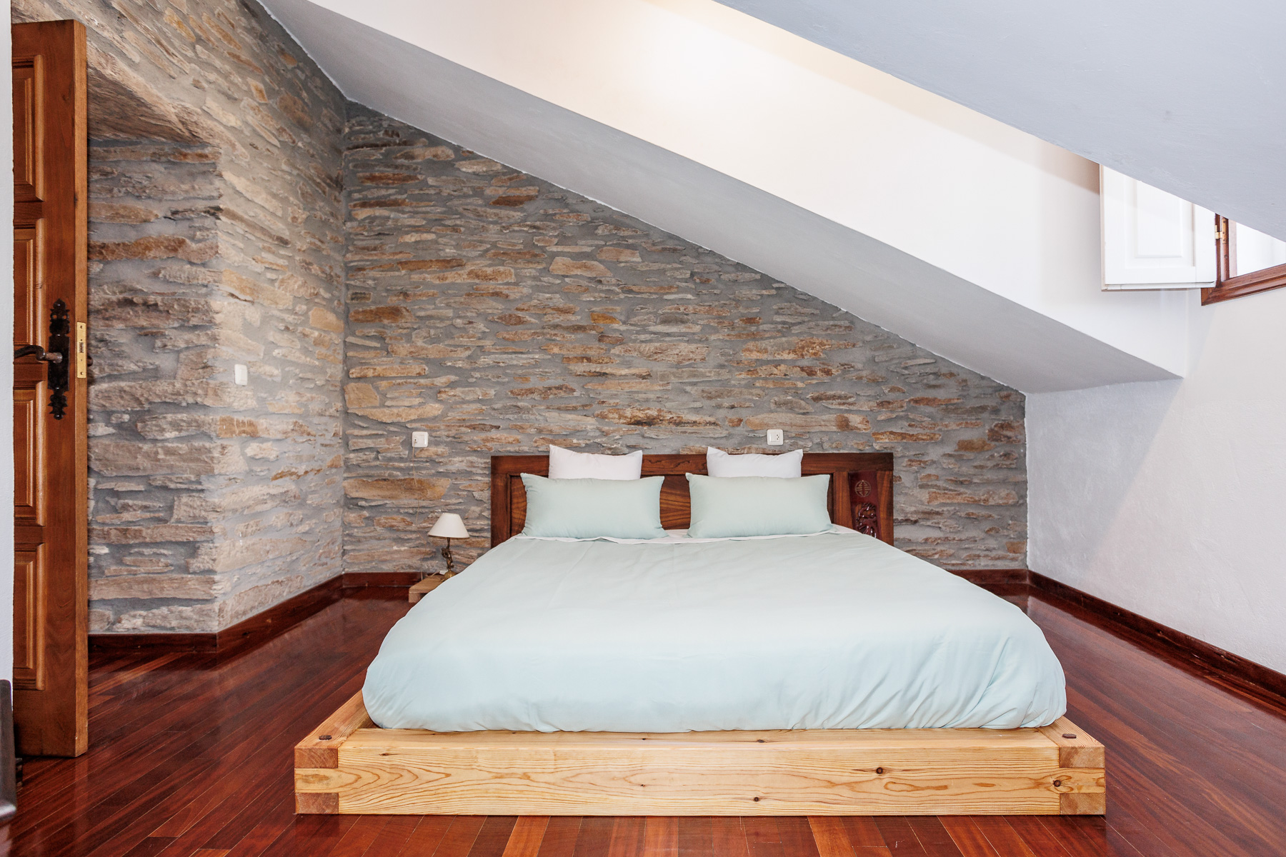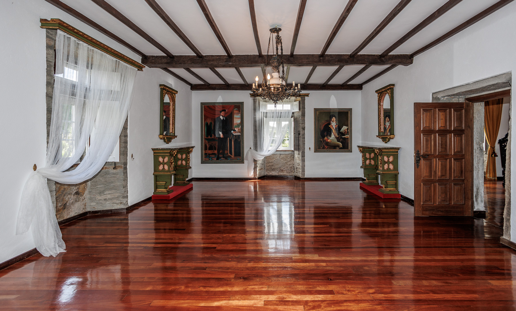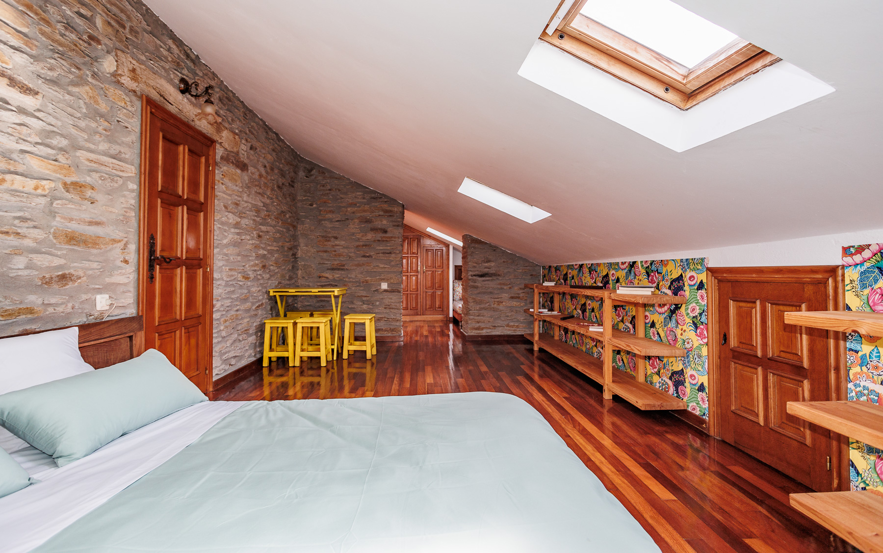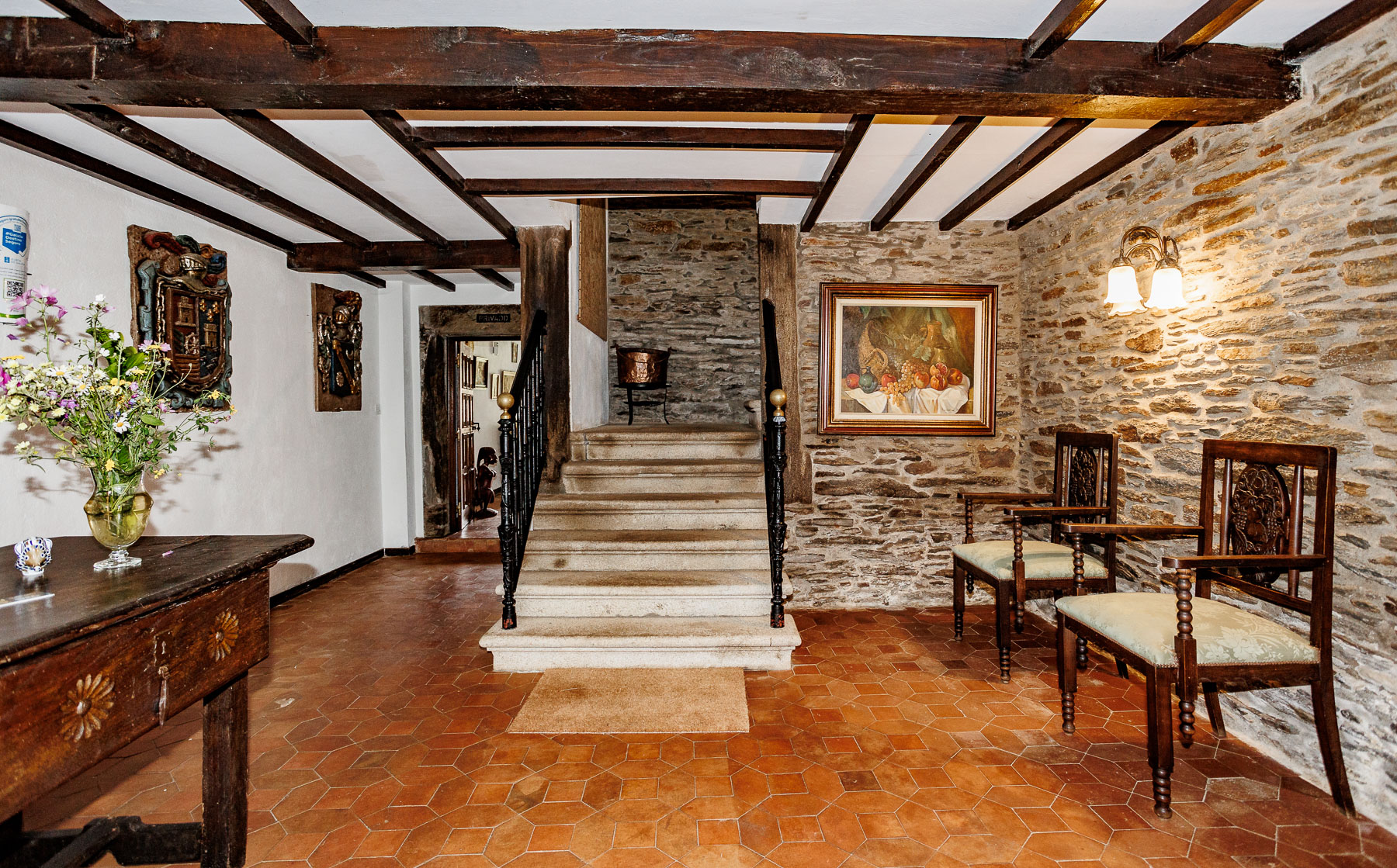 Cuando entras al Pazo, desde la puerta puedes dirigirte a cuatro posibles direcciones: la subida por sus maravillosas escaleras de granito, la parte del fondo que te comunica con el jardín posterior, la izquierda (hoy tapiada, que comunica con la casa de los caseros) y la derecha que nos lleva a un gran salón, dos habitaciones y un cuarto de baño. Este espacio se puede alquilar como apartamento independiente.