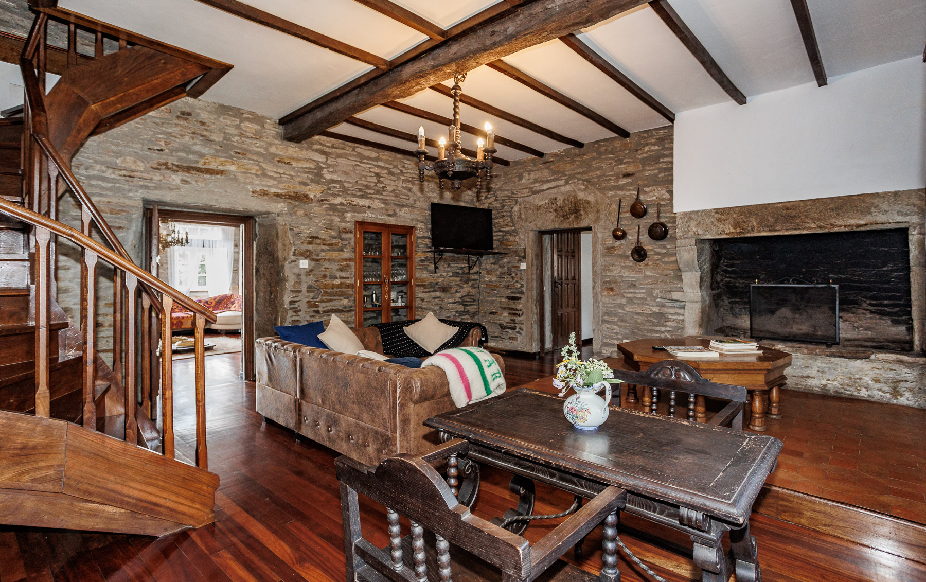 En la primera planta, se adivina la grandeza de lo que un día fue el lugar, está decorado con grandes salones que pueden usarse como lugares comunes para disfrutar de lecturas, escrituras, música..... o si el comprador lo prefiere, es muy fácilmente reformable en habitaciones. La madera de sus suelos está en perfecto estado, así como el techo, puertas, camas, armarios.... todo con armonía. En este momento en esta primera planta hay dos dormitorios completos con baño y 4 salones, uno de ellos con una preciosa lareira en granito.